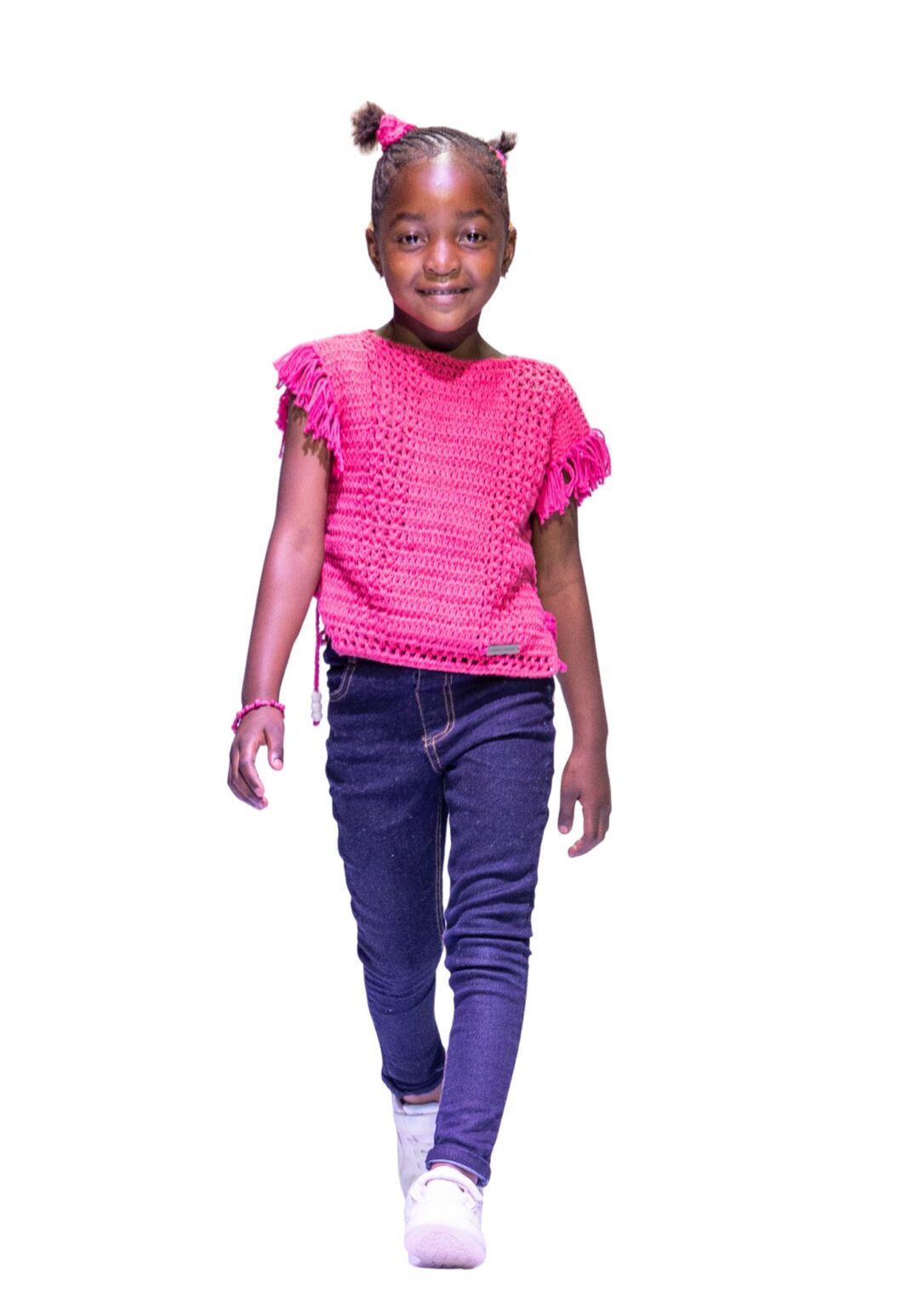 A vibrant toddler top featuring bright-colored crochet, delicate lace detailing, tasseled sleeves, and adjustable side-tie accents for a playful bohemian look.