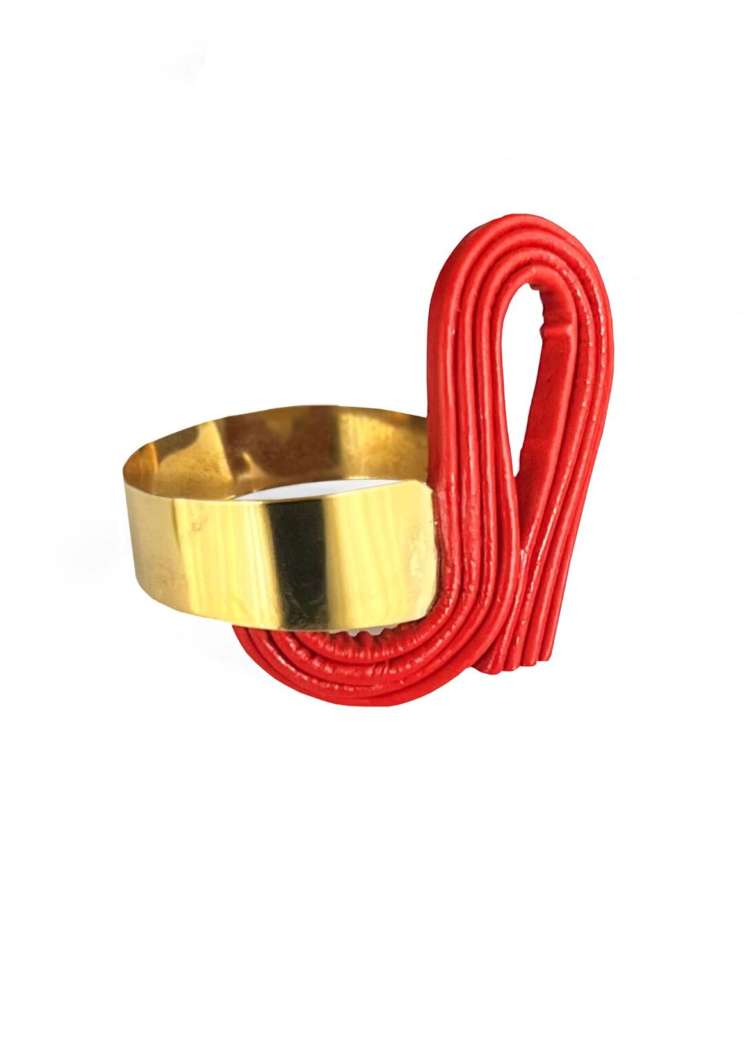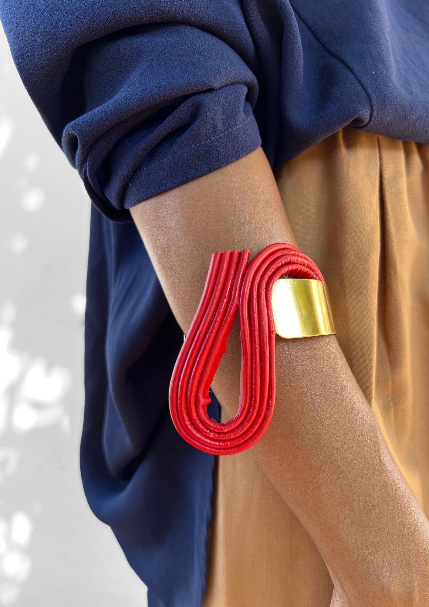 This handcrafted piece features brass and emerald Red leather offcuts, blending structure with soft texture in a refined, sustainable design. Whether worn solo or stacked, the Odyssey Bracelet adds a rich, earthy accent to any look.