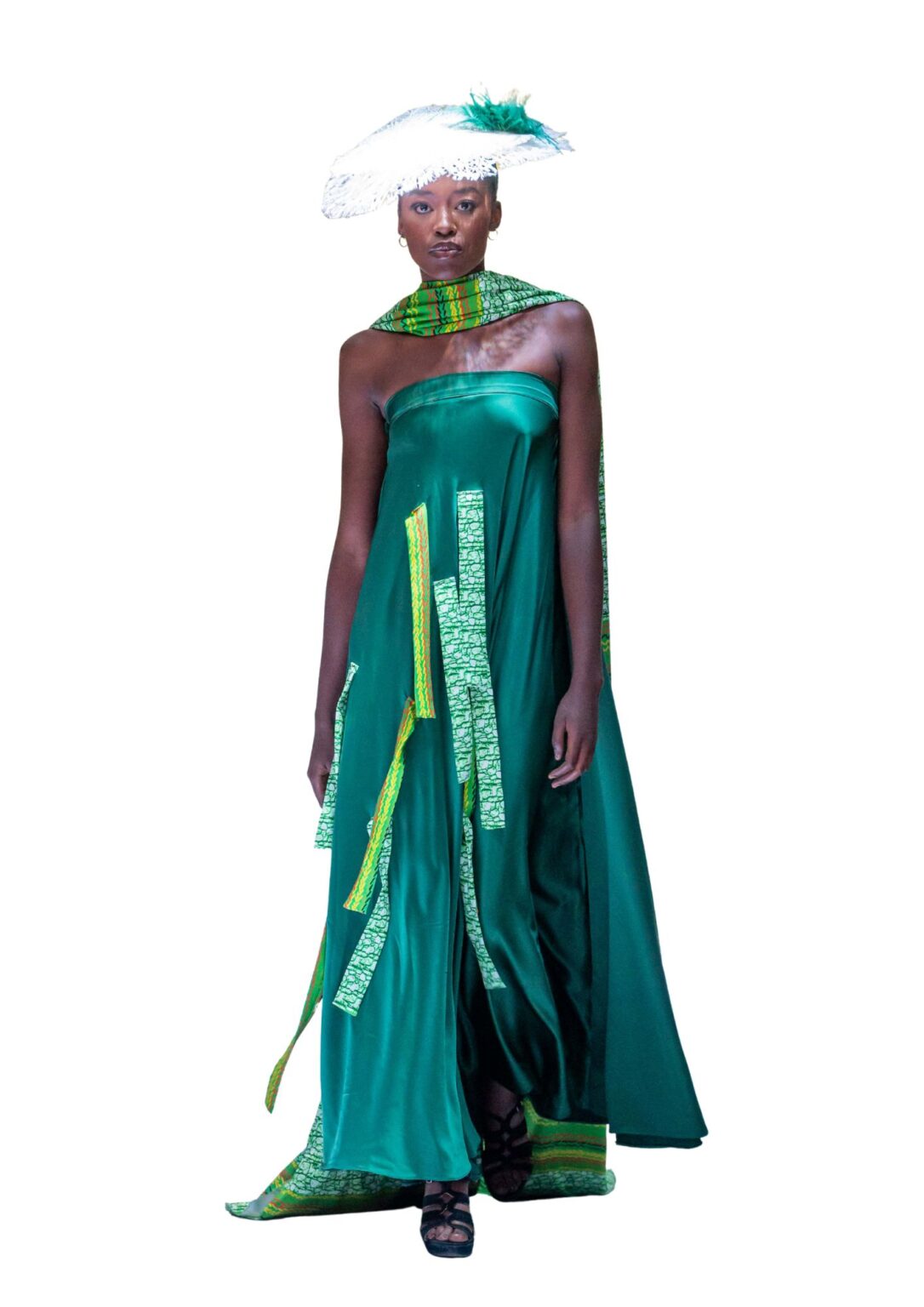 Command attention with the Pfeka Royalty Kaftan, a breathtaking gown that embodies quiet majesty and modern cultural luxury. This stunning piece flows in rich emerald green, creating a regal silhouette that drapes elegantly from a textured strapless bodice adorned with intricate green crochet or beadwork detailing. The luxurious fabric cascades to the floor in graceful folds, while striking vertical panels featuring Pfeka’s signature Zimbabwean motifs in complementary green tones create dynamic visual interest down the front of the gown.