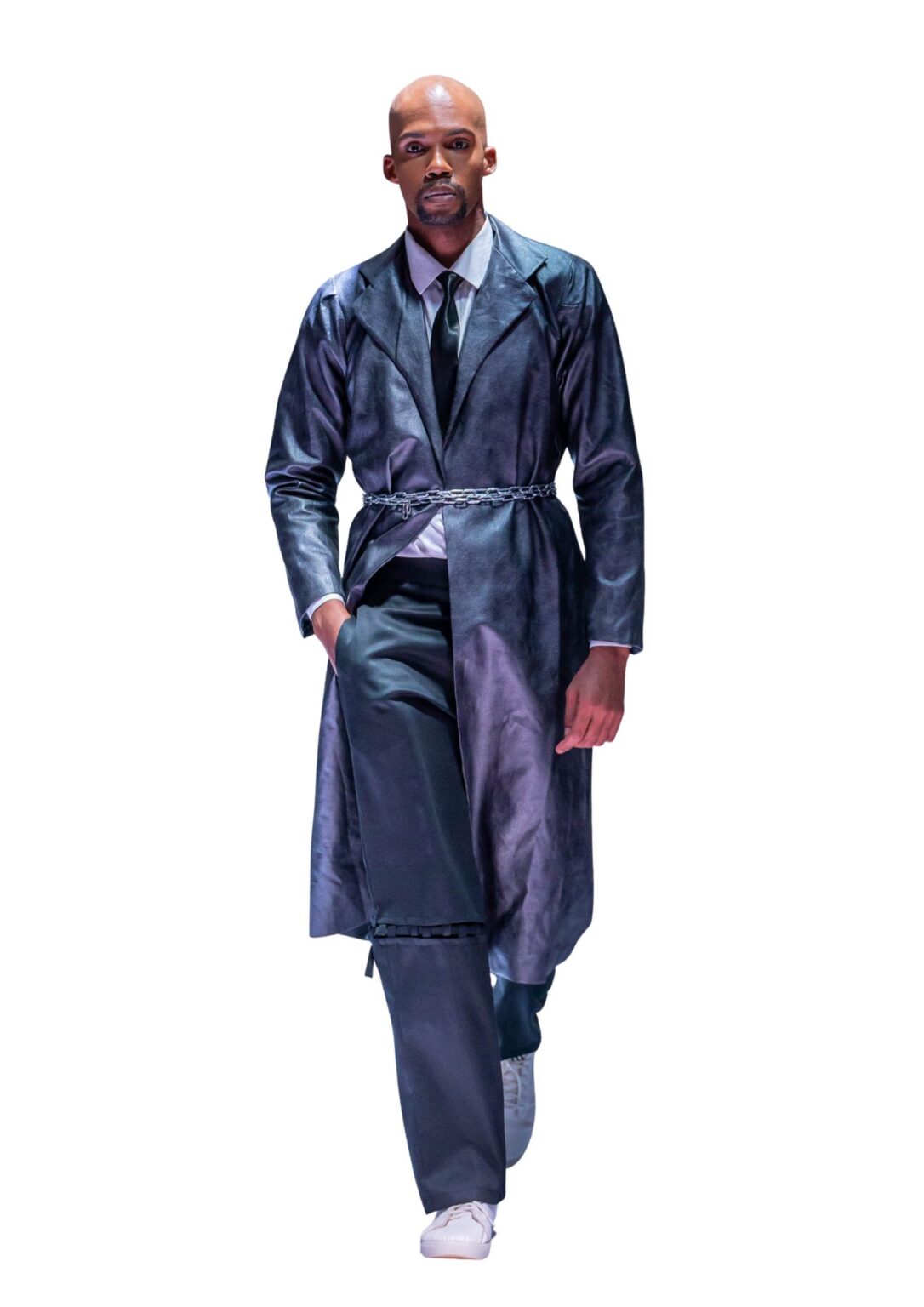 A deep charcoal Planet Avur longline coat with a subtle sheen, featuring tailored lapels and a chain-belted waist for a sharp, structured silhouette.