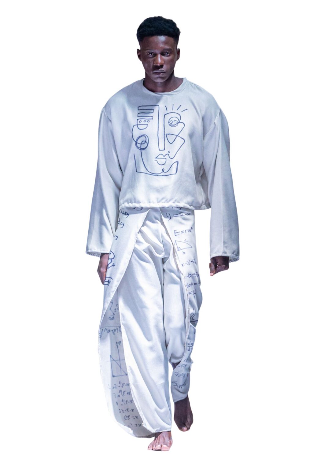 Planet Avur’s soft white graphic look pairs an oversized long-sleeve top featuring a bold line-drawn face print with relaxed trousers finished with a sketched equation-style panel for an art-forward streetwear statement